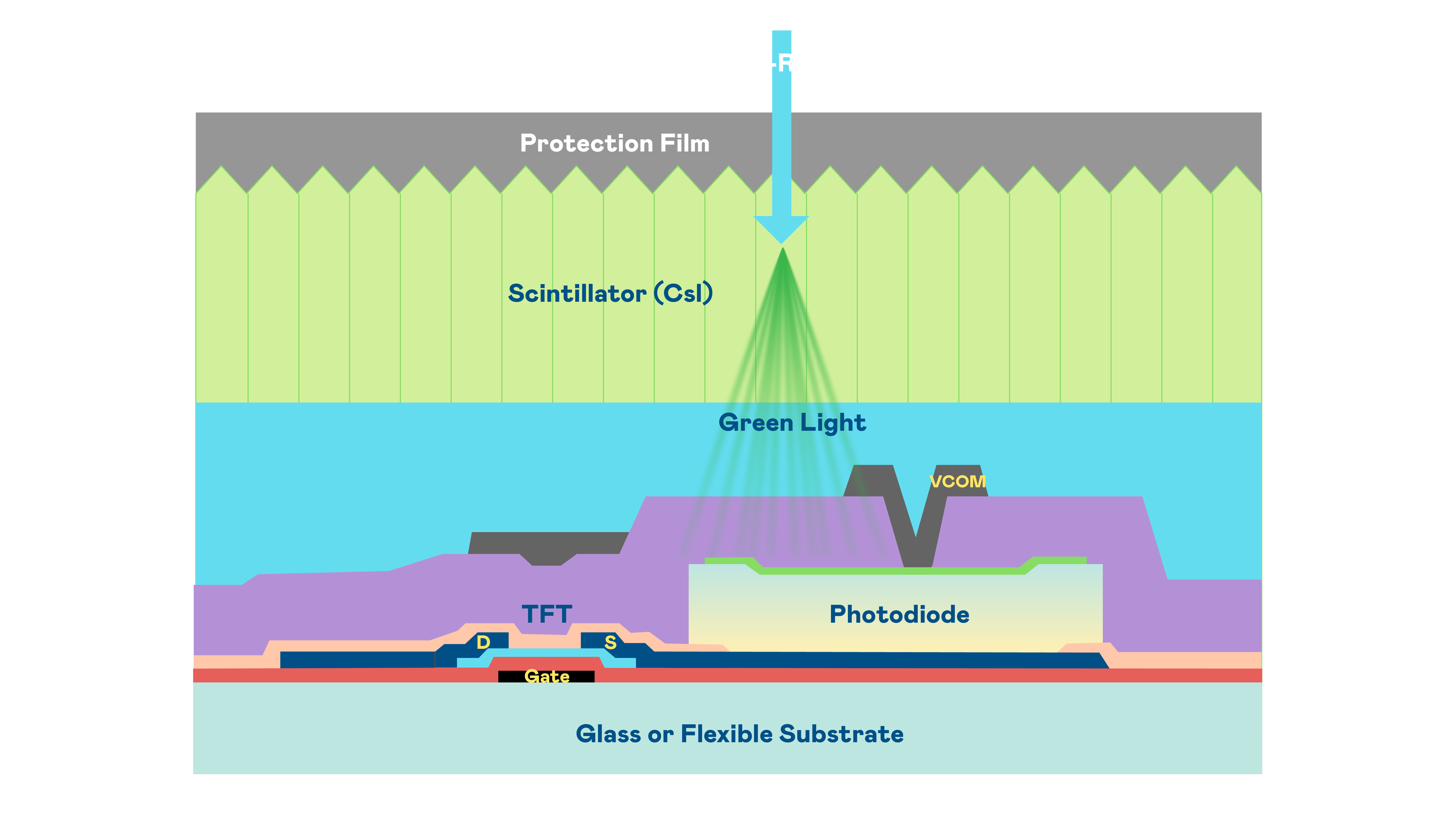 w66旗舰厅的X光影像感測陣列使用薄膜電晶體 (TFT) 作為每個像素的讀取開關,搭配光電二極體(Photodiode)的光電轉換元件,用以感測X光影像訊號。